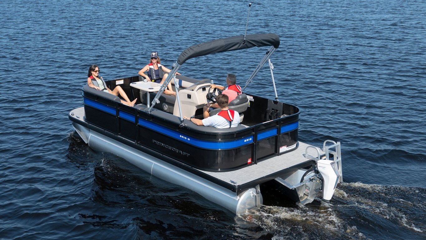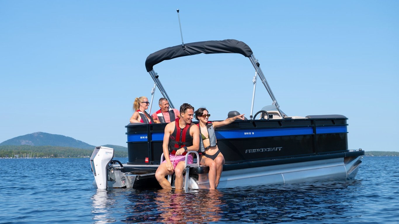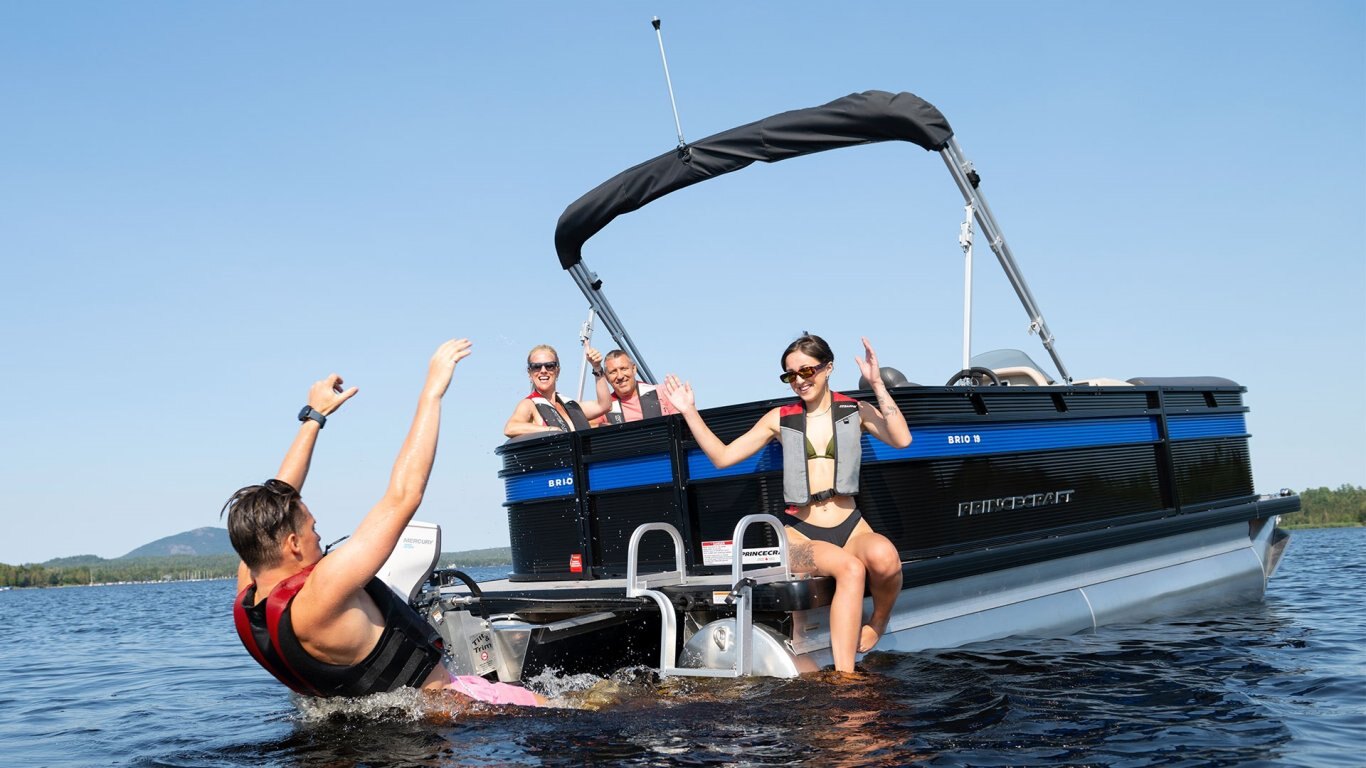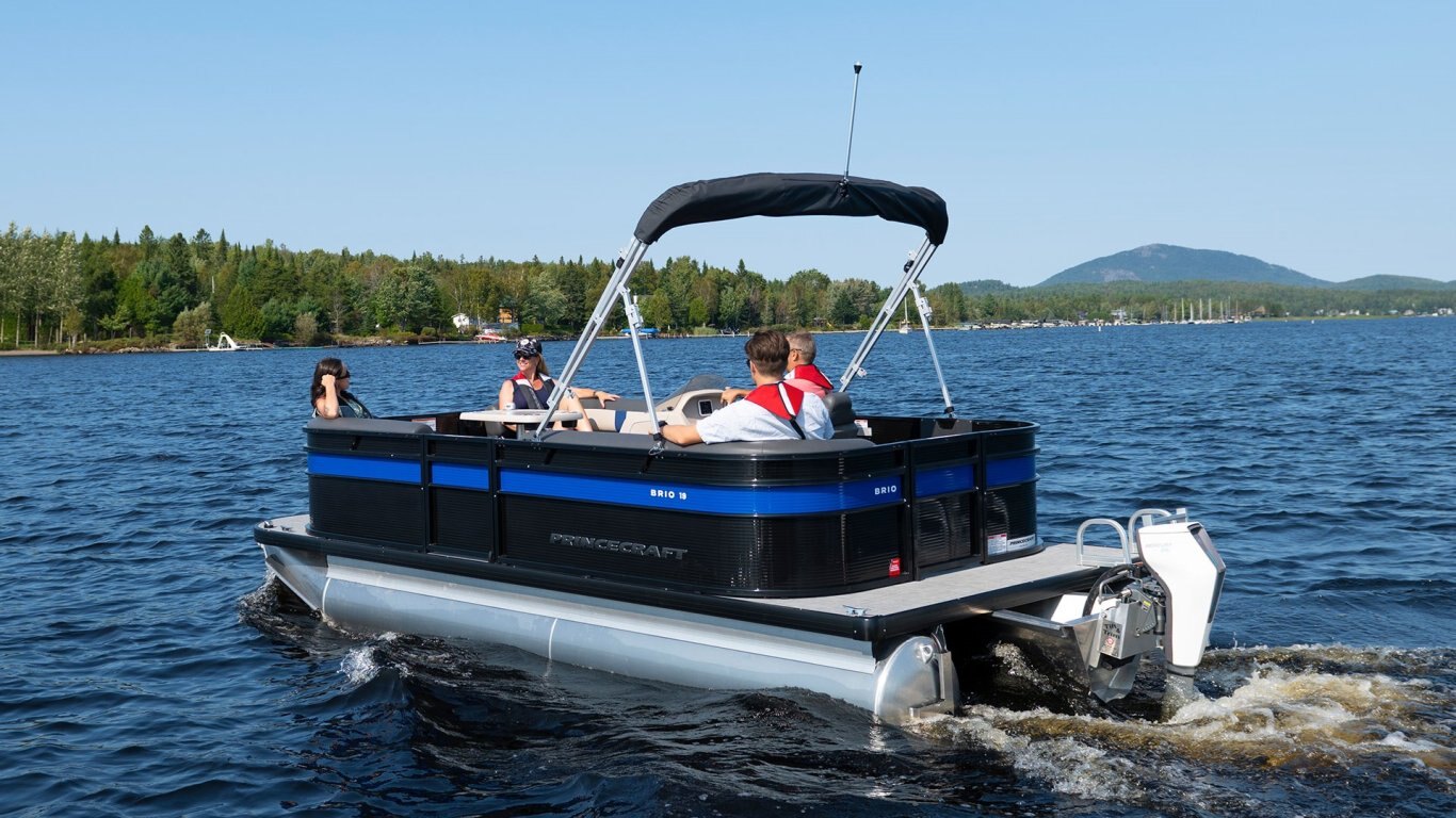 - L'édition noire comprend des garde-corps peints en noir, une sellerie foncée, un graphisme bleu électrique, un siège capitaine de luxe, un Princecraft 3D®black chrome logo on both sides and front door