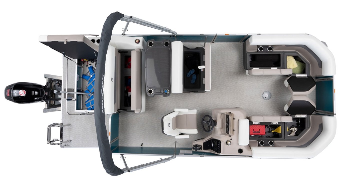• L'ensemble Mood comprend: Table à goûter rectangulaire à l'avant, boîte à gants, chargeur de téléphone portable sans fil, pare-brise en verre, 2 filets de rangement et applique en vinyle matelassé sur le gouvernail